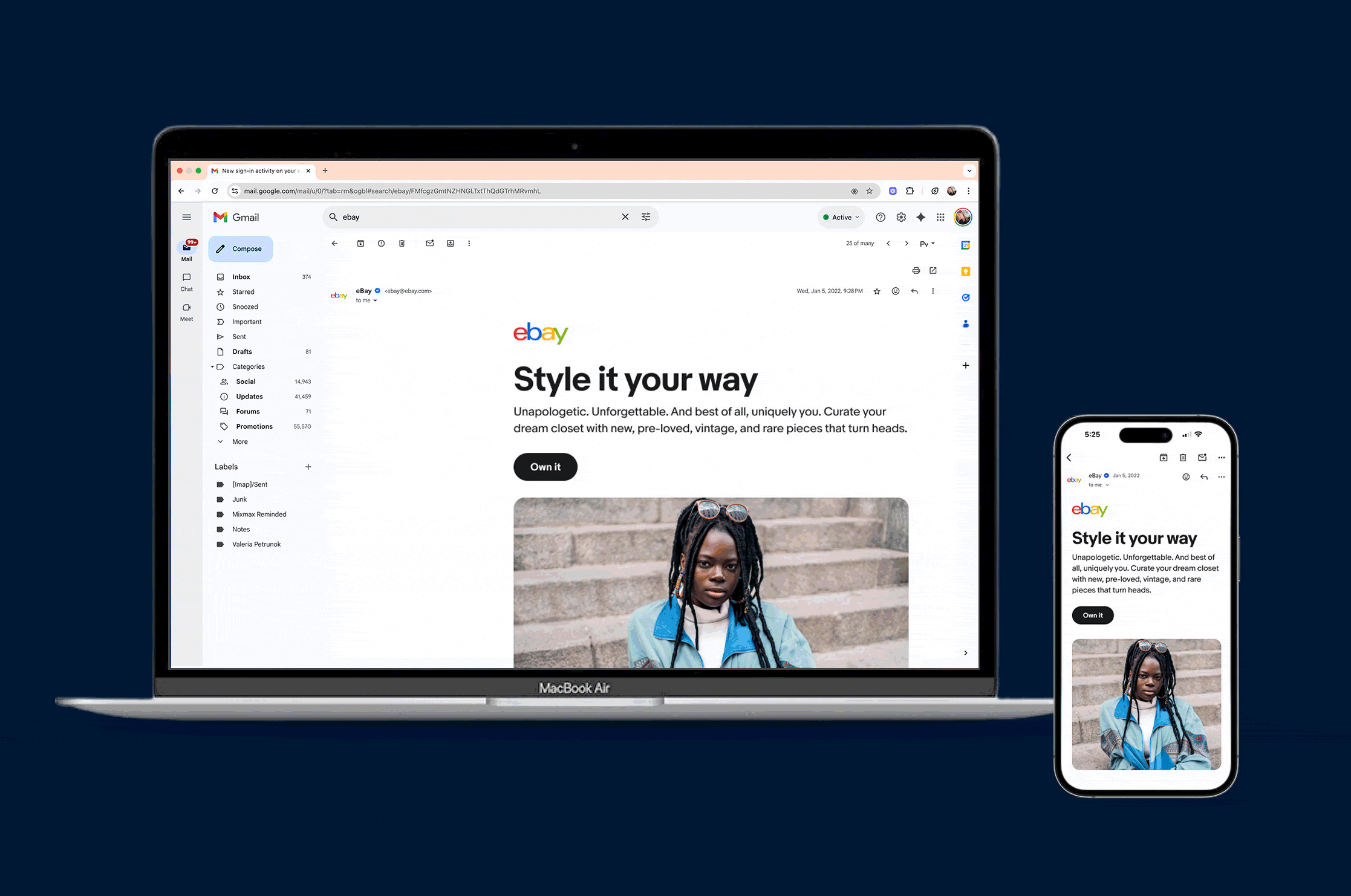 I designed email campaigns for eBay sellers and buyers, adapting each layout across desktop and mobile while supporting both light and dark modes in line with eBay’s design system.