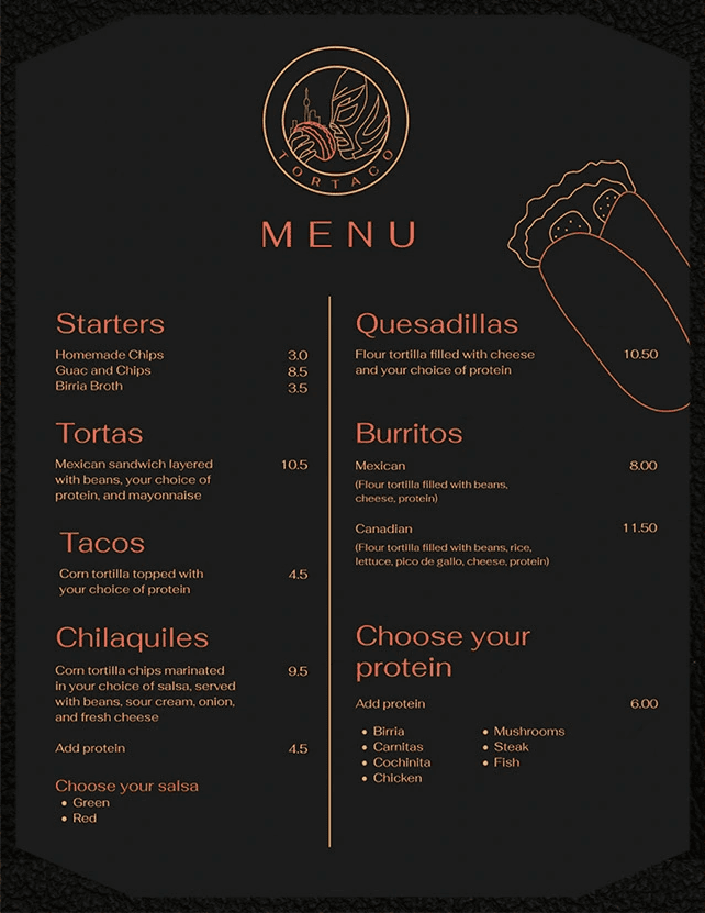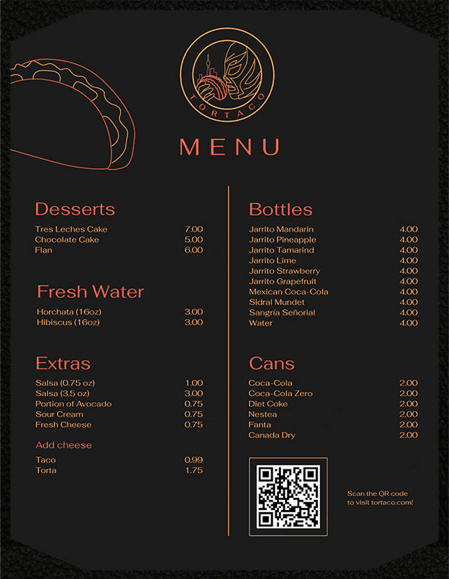 TorTaco is a modern taco shop in Toronto offering authentic Mexican cuisine with a sleek, urban vibe. The brand values authenticity and simplicity, focusing on quality ingredients and a vibrant, minimalist design that appeals to a middle-class clientele seeking a flavorful and welcoming dining experience.